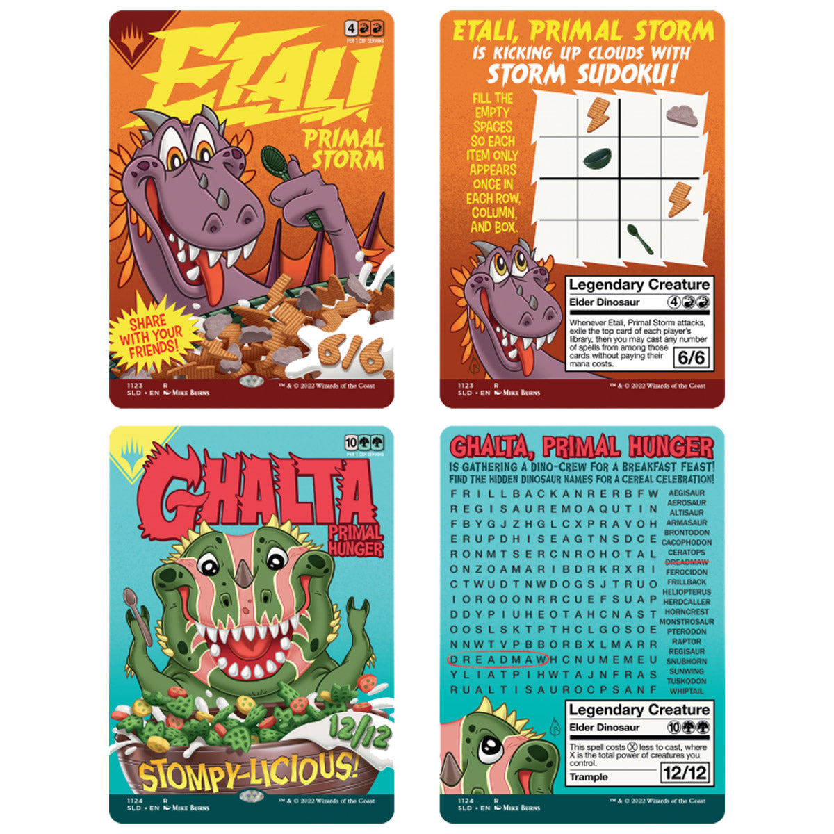 We’ve never been more cereal about a Secret Lair drop. Celebrate the most important meal of the day with three powerful creatures reimagined as mascots that might appear on a box of sugar-blasted morning chow. The coolest part? These cards are Reversible, meaning both sides are mechanically the same but feature different art—fittingly, the front and the back of the cereal box, complete with activities! Plus, each card has been fortified with essential art by Mike Burns. By adding these to your deck or collection, we guarantee your breakfast will finally be complete.